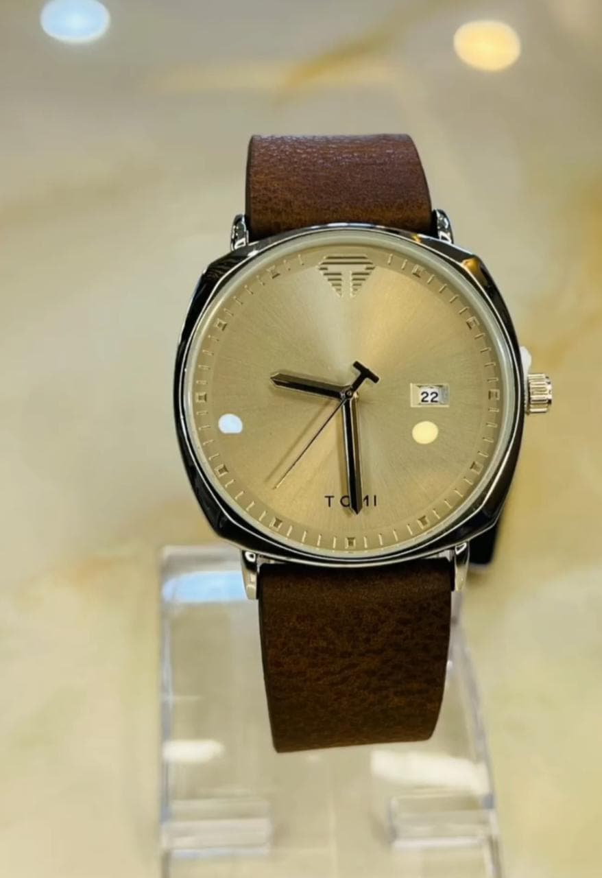 Stylish TOMI watch with dark brown leather strap and sleek gold square dial for men.