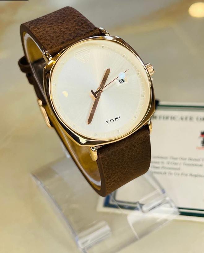 This TOMI watch combines modern design with classic elegance. Its square gold dial and minimal markers give it a sleek, sophisticated look, while the dark brown leather strap adds warmth and comfort for all-day wear.
